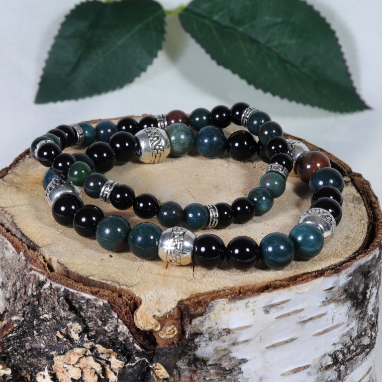 Bracelet élastique en Onyx, Jaspe Héliotrope et perles en acier.