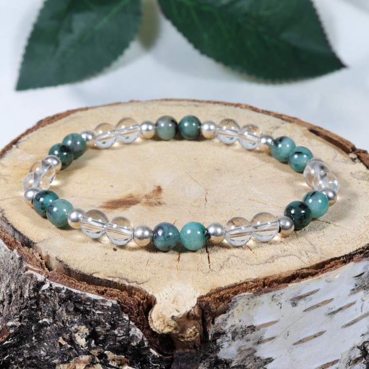 Bracelet élastique en Emeraude, Quartz et perles en Argent.
