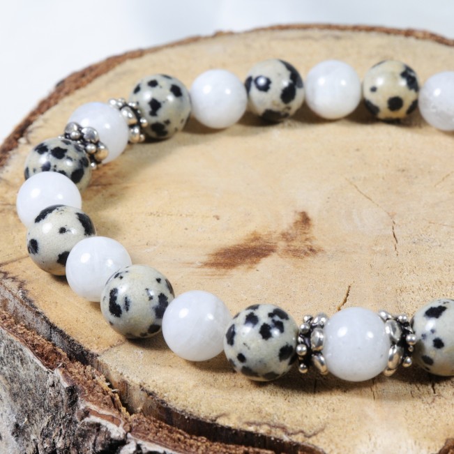 Bracelet élastique en Jaspe Dalmatien, Pierre de Lune blanche et perles en Argent.