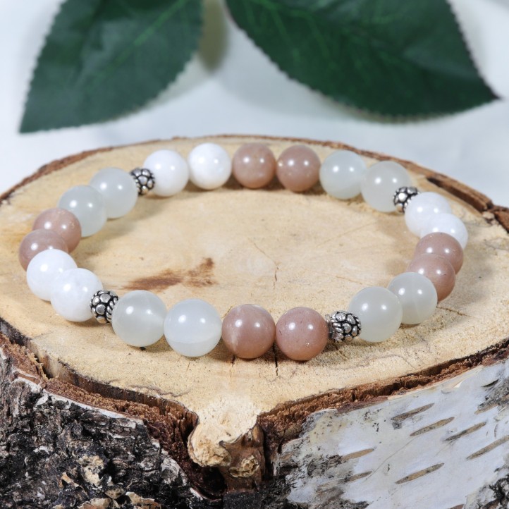 Bracelet élastique en Pierre de Lune blanche, grise et pêche avec perles en Argent.