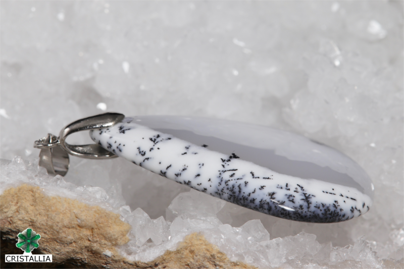 L'Opale dendritique est une variété d'Opale commune (sans reflets) qui se caractérise par la présence de petites dendrites noires de manganèse.