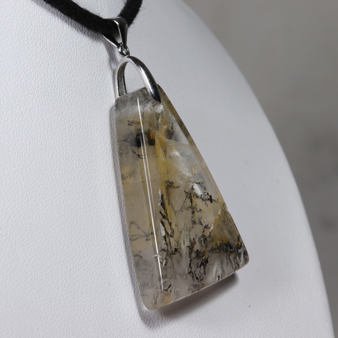 Le Quartz Dendritique est un quartz avec du manganèse qui s'est faufilé dans les fractures et qui a formé des petites dendrites. On peut observer ce paysage minéral grâce à la transparence du quartz.