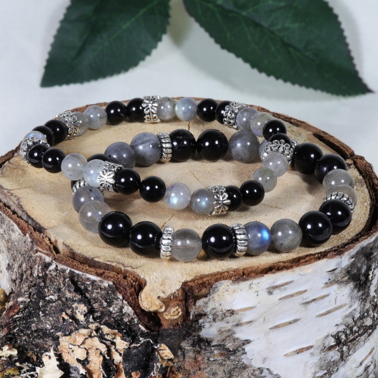 Bracelet élastique en Tourmaline Noire, Labradorite et perles en acier.