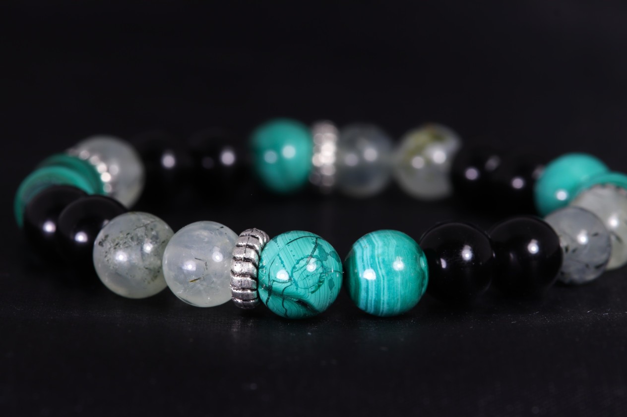 Bracelet élastique en Obsidienne Noire, Malachite, Prehnite et perles en acier.